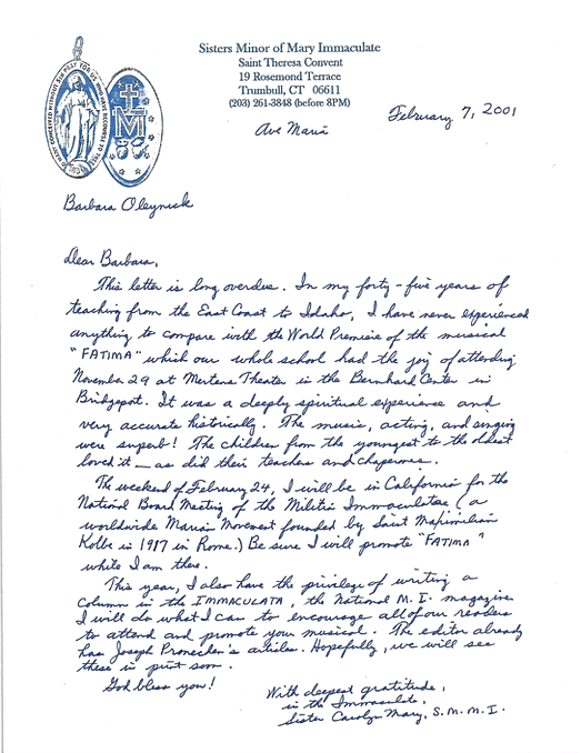 De la Hermana Carolyn Mary, Hermana Menor de María Inmaculada. Directora del Colegio Santa Teresa.